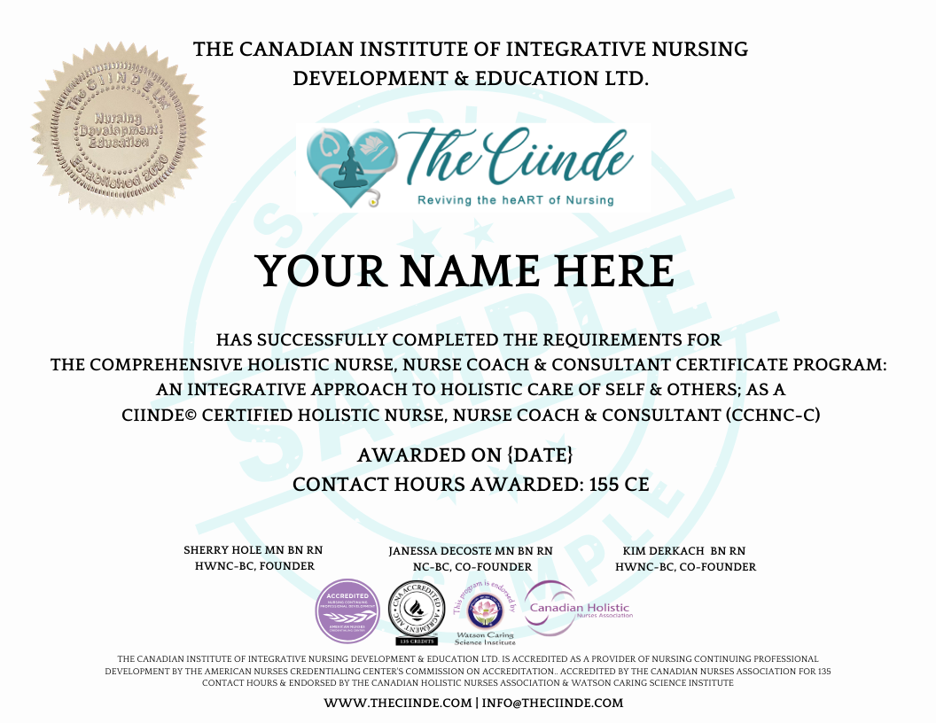 TheCIINDE© Complementary Holistic Nurse, Nurse Coach & Consultant Certificate program at The Canadian Institute of Integrative Nursing Development & Education (TheCIINDE)© is internationally recognized and holds two very distinct accreditations. We are accredited by the Canadian Nurses Association (CNA), ensuring our program meets rigorous Canadian standards for nursing education. We are also an ANCC Accredited Provider, meaning our continuing education offerings meet the highest standards set by the American Nurses Credentialing Center (ANCC). Our program is endorsed by the Canadian Holistic Nurses Association (CHNA) and Watson Caring Science Institute (WCSI), further reinforcing our credibility and professional standing. Additionally, our students are taught how to actively advocate for the recognition of Holistic Nursing, Nurse Coaching and Nurse Consulting within their respective regulatory bodies. One of our core assignments involves engaging directly with regulatory organizations to foster awareness and ensure alignment with professional nursing standards.